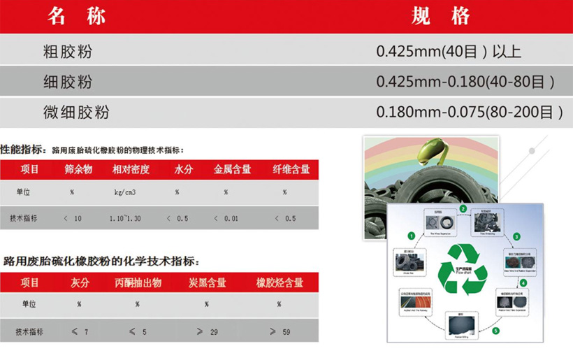 該產品針對國內膠粉來源變異性大,行業(yè)不規(guī)范的不足,采用穩(wěn)定的高品質胎源及分類分揀的技術手段,生產出性能穩(wěn)定,雜質含量低的高品質硫化橡膠粉。產品符合JT/T 797-2011《路用廢胎硫化橡膠粉》